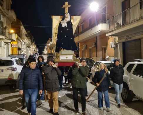 Nelle strade deserte della notte freddissima, l'Addolorata procedeva lentamente nel silenzio rotto solo dalla preghiera del Santo Rosario, animata dalle Suore del Sacro Cuore della Beata Maria Schininà, e dal bisbiglio dei portatori.